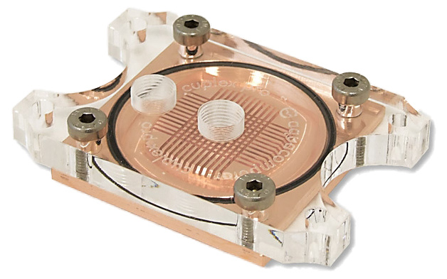 Das Herzstück jedes Wasserkühlungssystems ist der Prozessorkühler. Er soll die Wärme der kleinen Prozessorkerne schnell aufnehmen und über eine große Oberfläche an das Kühlwasser abgeben.
